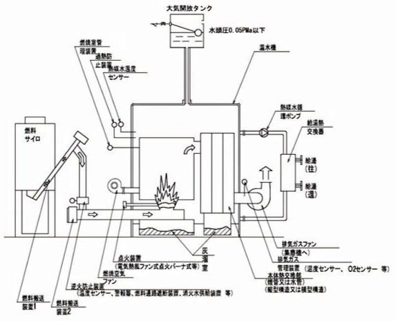 大気開放型温水機は伝熱面積が区分要件とされないため、化石燃料又は木質バイオマス燃料のいずれであっても、大容量の温水機が伝熱面積の制限なく使えます。